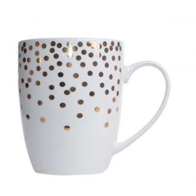 Porcelanowy, biały kubek w złote kropki.